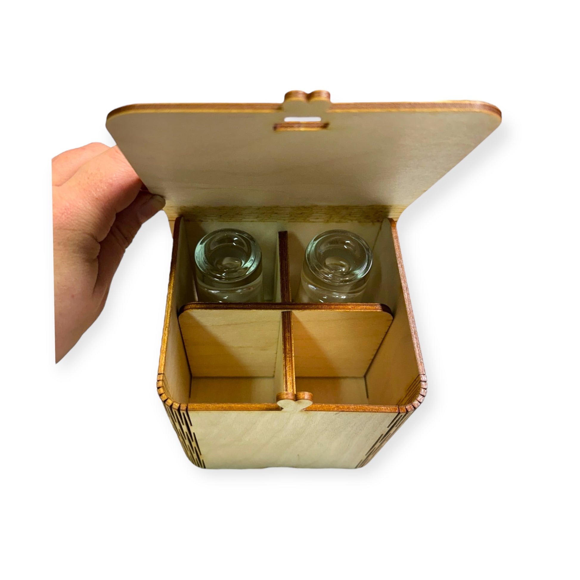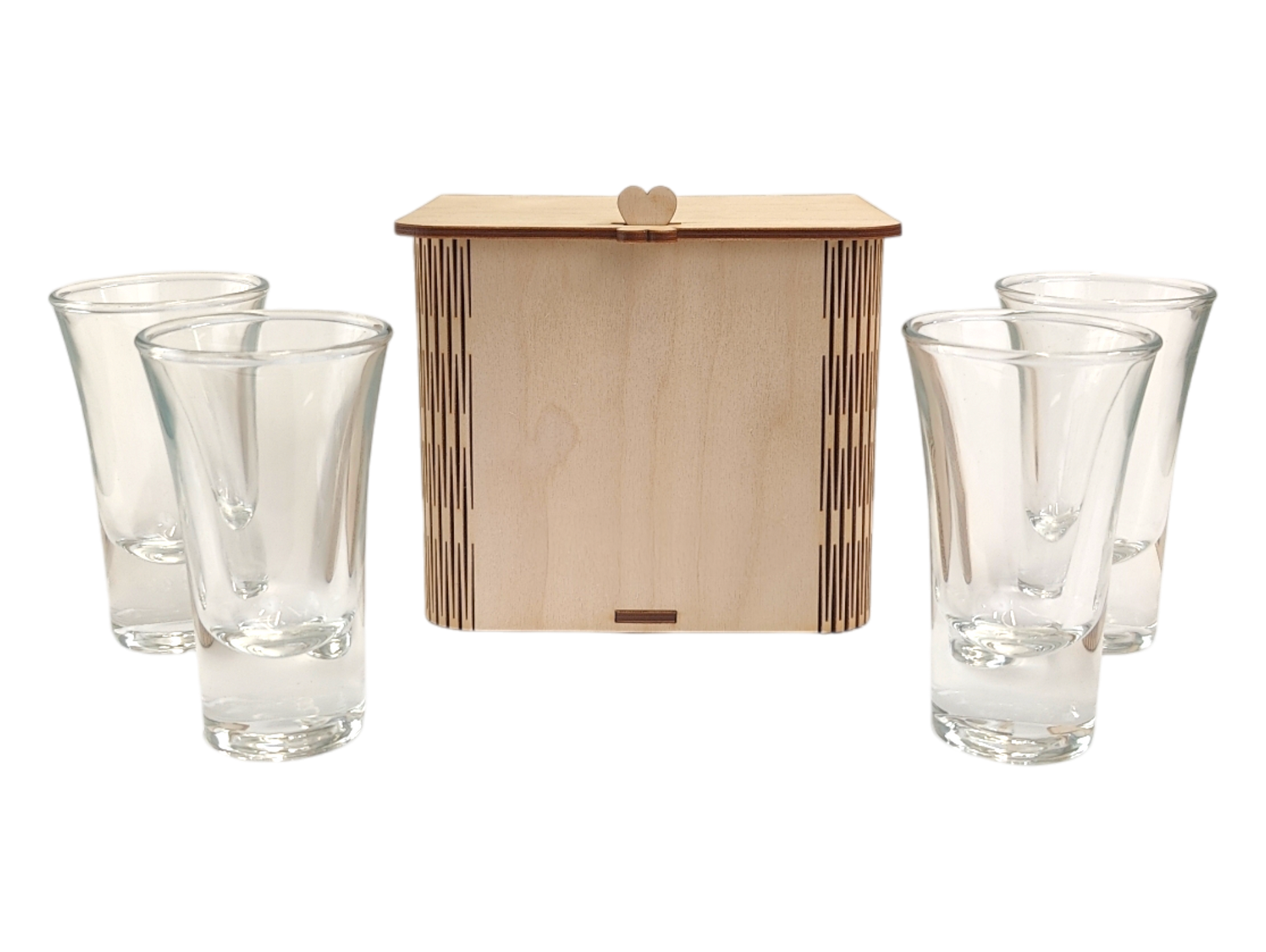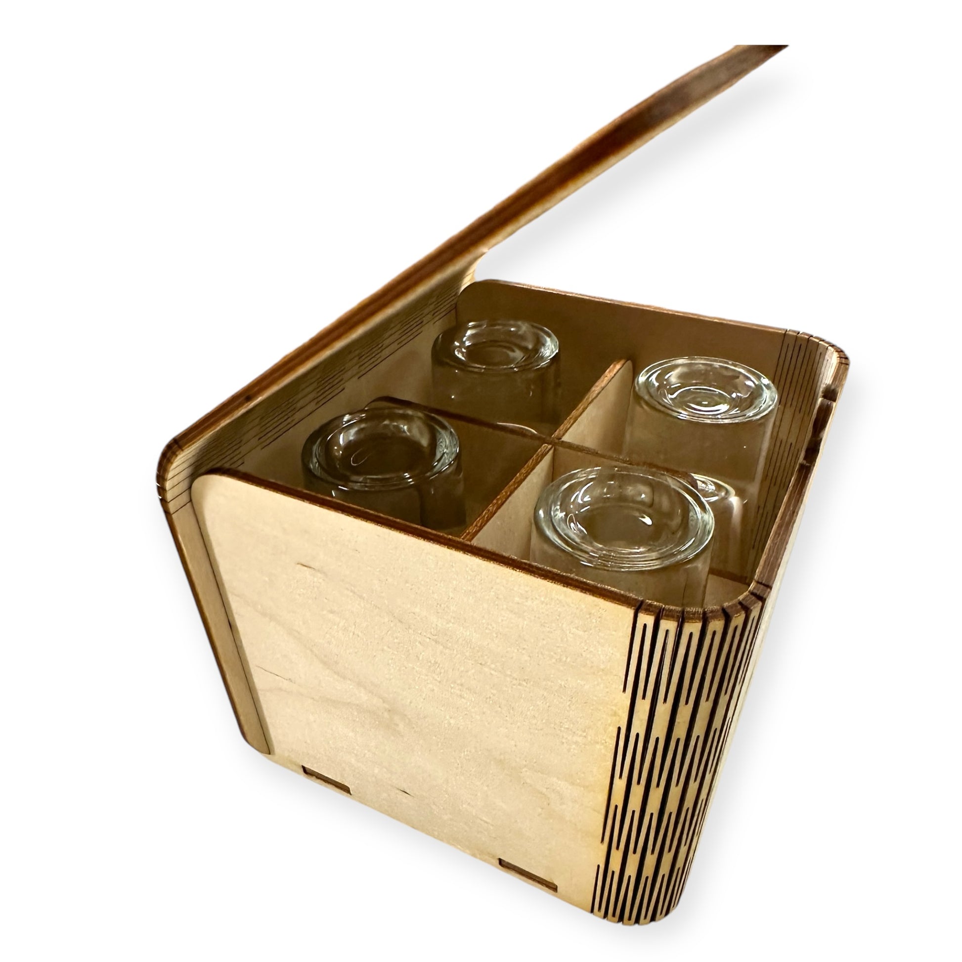 Neljän shottilasin setti koivuvanerirasialla.