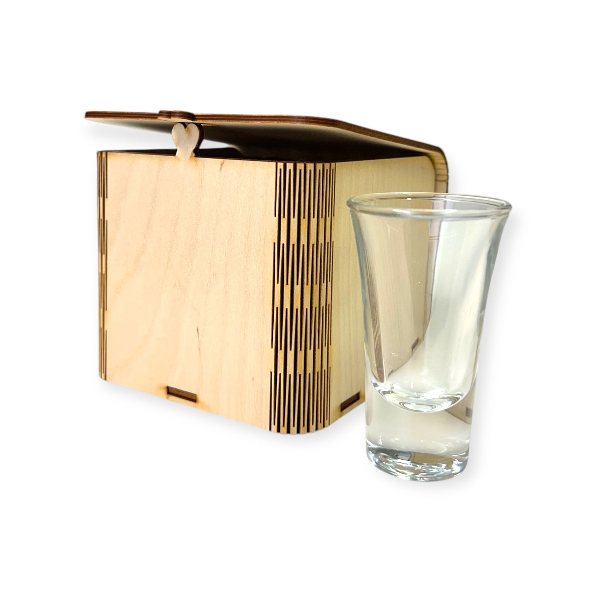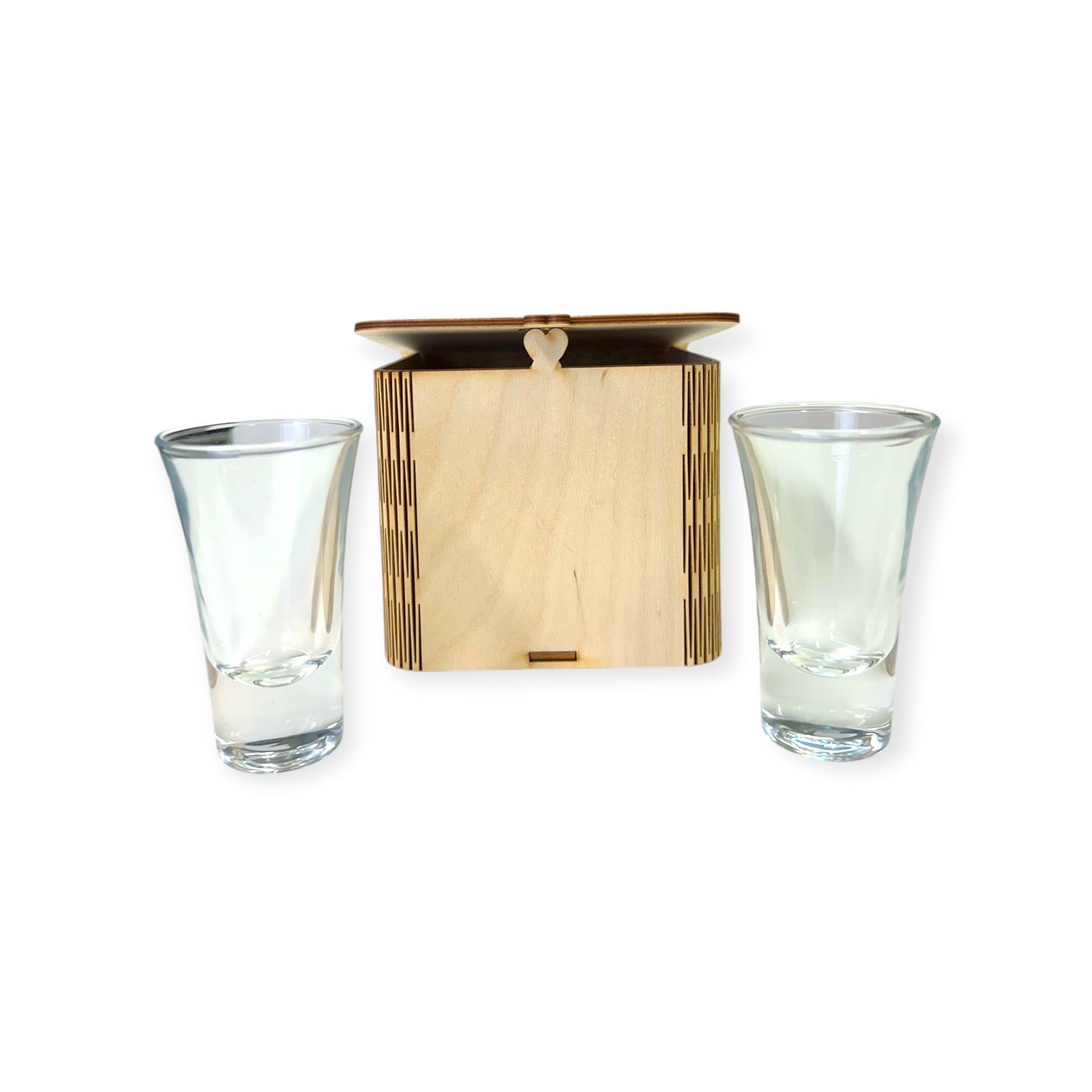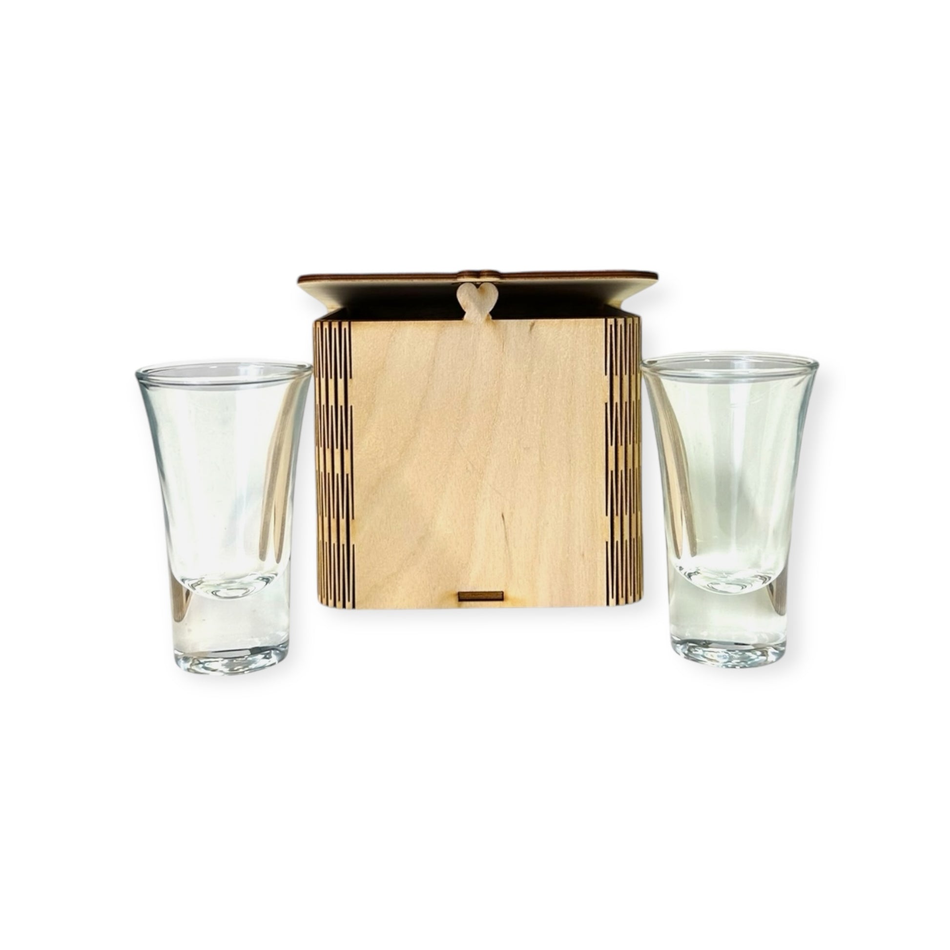 Neljän shottilasin setti koivuvanerirasialla.