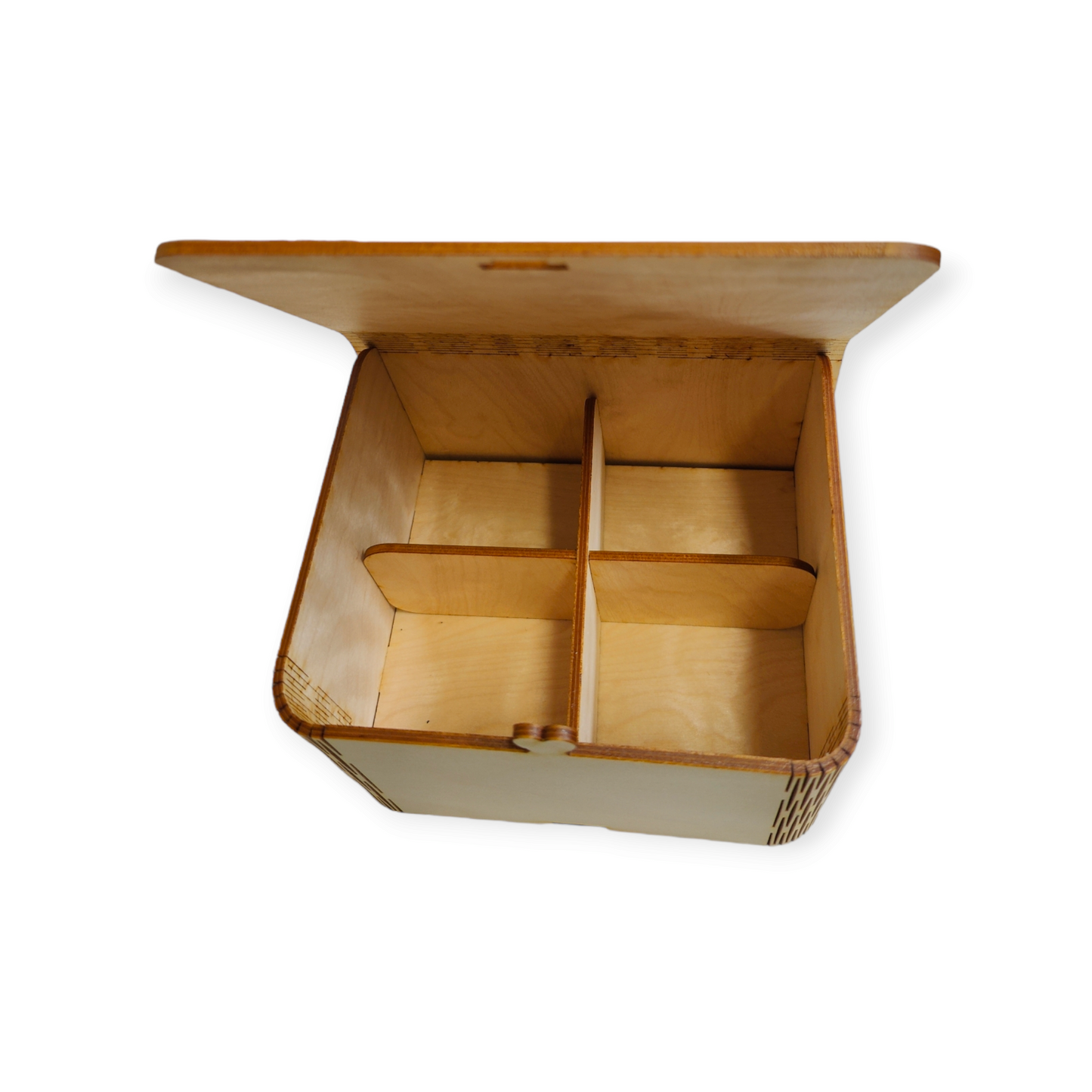 Teerasia, jonka sisällä on jakaja erilaisten teemakujen jaotteluun. Rasian sisään mahtuu hyvin normaali teepussi.